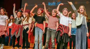 Die Kinder der Musical-AG der Südschule hatten sich als Piraten verkleidet und prägten die Stimmung der feierlichen Preisverleihung im Anneliese-Geske Musik- und Kulturhaus. Sie lieferten mit rhythmischem Fingerschnippen den nötigen Beat für einen Song des Sängers und Gitarristen Hannes Knechtges, der den musikalischen Rahmen setzte. Sie bedankten sich mit einer bunten Aufführung von Liedern aus dem Musical „Die Pantoffelpiraten“ für den Preis.